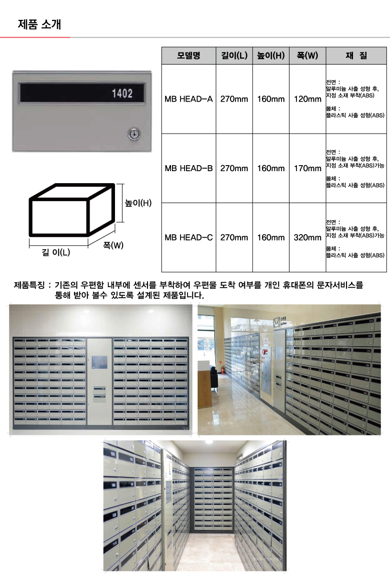 특징 우편함 내부에 센서를 부착하여 우편함 도착여부를 개인 휴대폰 문자서비를 통해 받아 볼 수 있습니다.